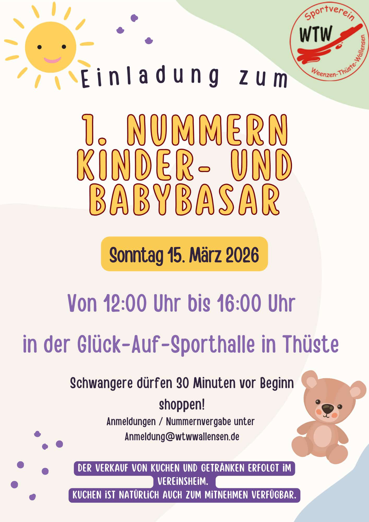Der WTW lädt am Sonntag, den 15. März 2026 von 12 bis 16 Uhr in der Glück Auf-Sporthalle in Thüste zum 1. Nummern Kinder- und Babybasar ein. Schwangere dürfen 30 Minuten vor Beginn bereits in die Halle. Der Verkauf von Kuchen und Getränken erfolgt währenddessen im benachbarten Vereinsheim. Kuchen ist natürlich auch zum Mitnehmen verfügbar. Anmeldungen und Nummernvergabe ist ab sofort unter anmeldung@wtwwallensen.de möglich.